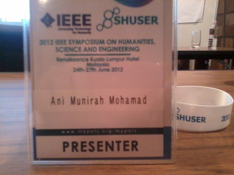 I presented a paper entitled “Benefits and Achievements of ICT Adoption by the High Courts of Malaysia” at the 2012 IEEE Symposium on Humanities, Science and Engineering Research (SHUSER 2012) on the third day of the conference days on 24-26 June 2012.